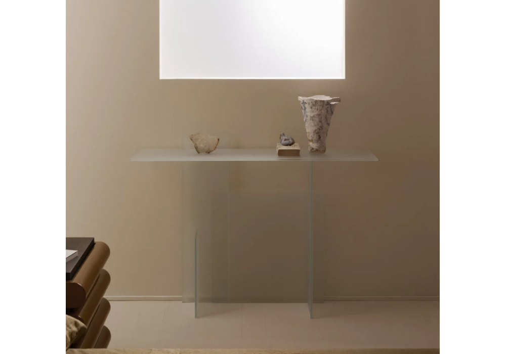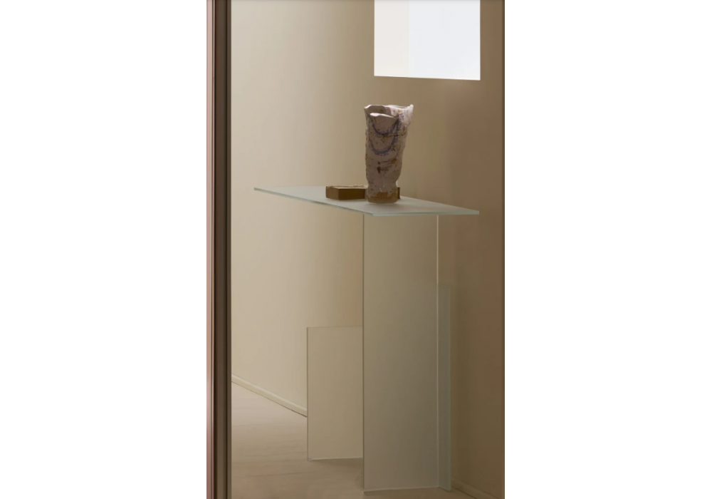 Kazimir diseñada por Michael Anastassiades para Glas Italia es una consola realizada íntegramente en un vidrio especial templado al ácido o extraligero de color verde. Las distintas láminas superpuestas se anclan entre sí según un proceso de unión UV. Kazimir está disponible en diferentes acabados.