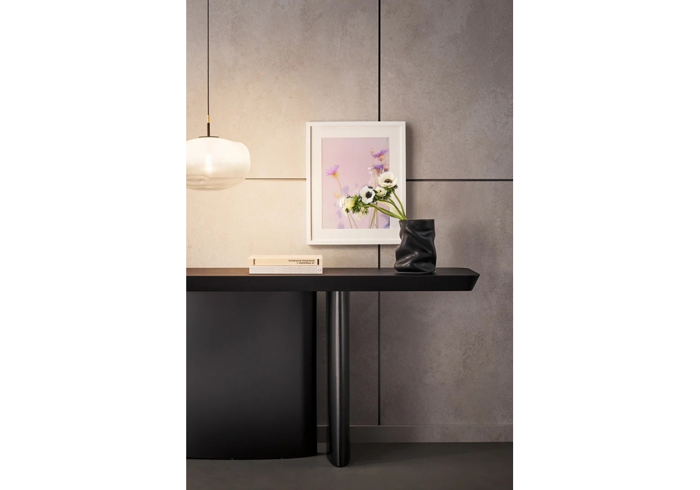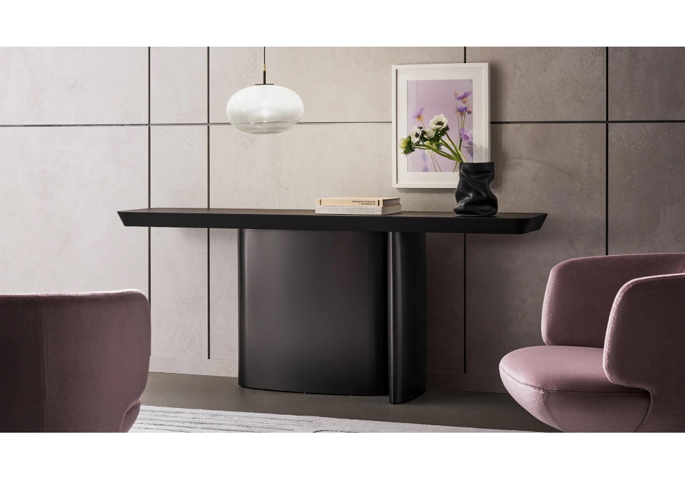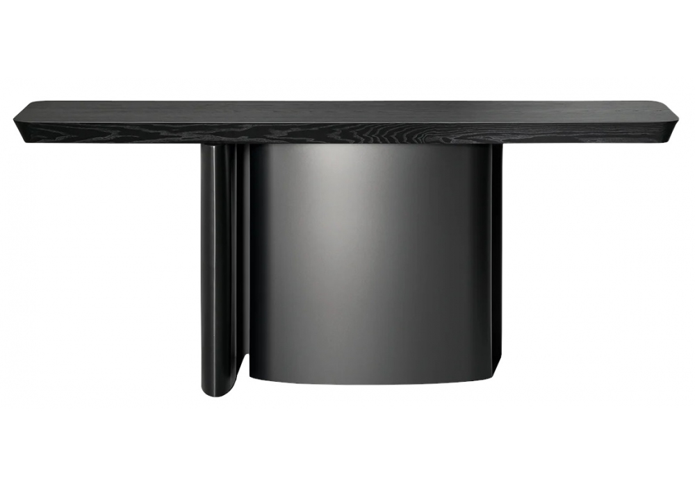 Una diseñada por Alain Gilles para Bonaldo es una consola con tapa de madera contrachapada o de madera recubierta de arcilla, base de metal revestida de madera o de arcilla. Disponible en diferentes acabados y tamaños.
