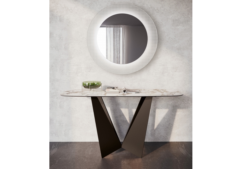 Eiffel diseñada por Signorotto+Partners para Dall'Agnese es una consola realizada con estructura de metal y tablero disponible en madera, cristal lacado o gres acoplado a cristal.