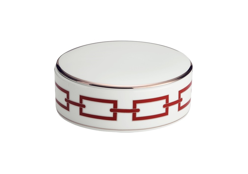 Scatola Talco Catene Scarlatto diseñada por Ginori 1735 es una caja redonda decorada con tapa.