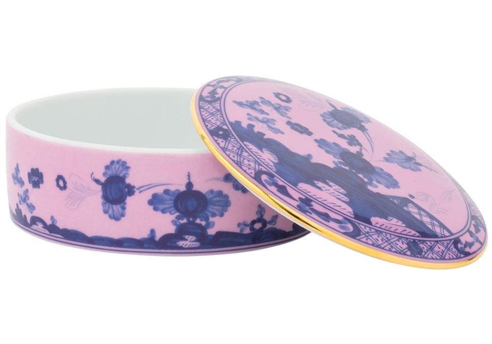 Scatola Talco Oriente Italiano Azalea diseñada por Ginori 1735 es una caja redonda decorada con tapa.