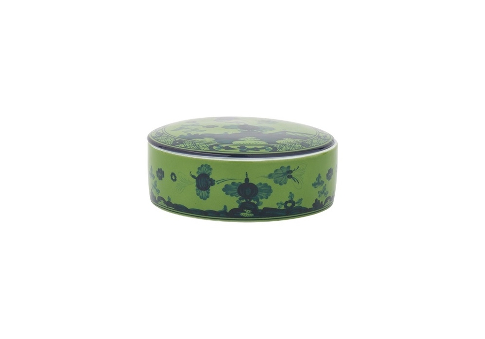 Scatola Talco Oriente Italiano Malachite diseñada por Ginori 1735 es una caja redonda decorada con tapa.