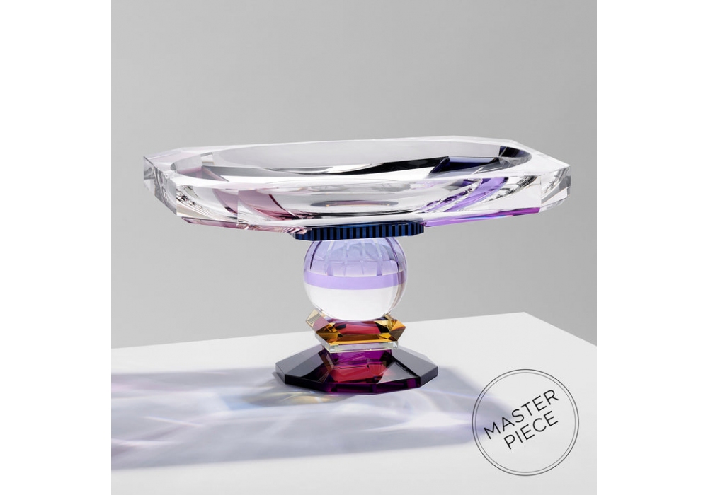 Georgia producido y firmado por Reflections Copenhagen, es un centro de mesa de cristal estructurado por varios elementos geométricos tallados y acabados a mano en transparente, azul, púrpura mixto, transparente y amarillo.
