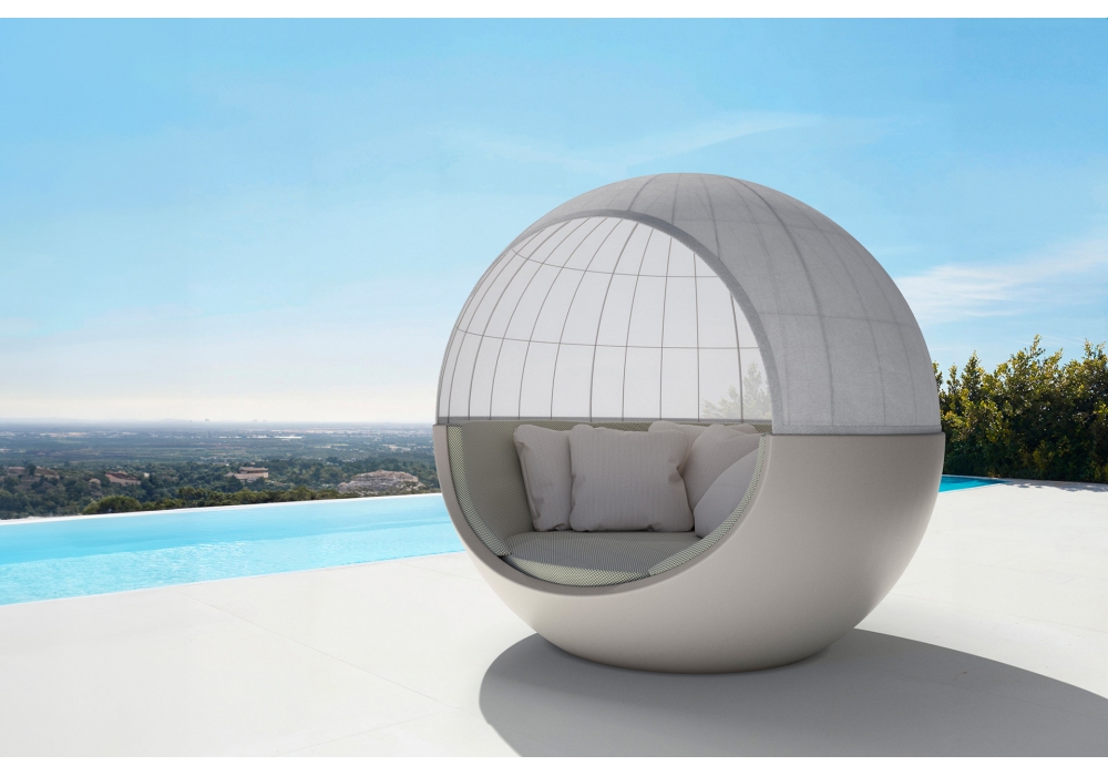 Moon diseñado por Ramón Esteve para Vondom es un daybed de forma circular con sistema giratorio en el que descansa su base, lo que permite que la pieza gire sobre su propio eje. Articulada a través de dos hemisferios, la base es realizada en polietileno moldeado por rotación con la posibilidad de retroiluminación LED, mientras que el parasol es realizado de tela. Moon es una pieza ideal para ambientes de ocio o chill-out.