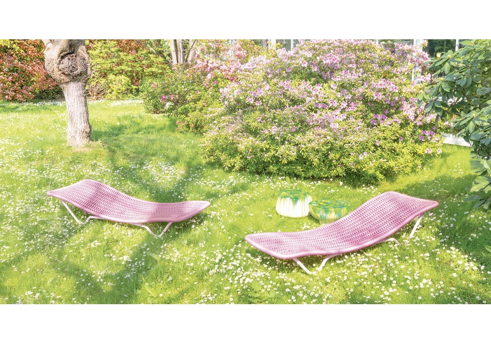 Jardín diseñada por CRS Paola Lenti es una chaise longue con funda fija tejida a mano con cuerdas planas de hilo Twiggy. La estructura es de aluminio pintado brillo con puntas de plástico. La colección Jardín es un homenaje a la arquitecta y diseñadora Clara Porset.