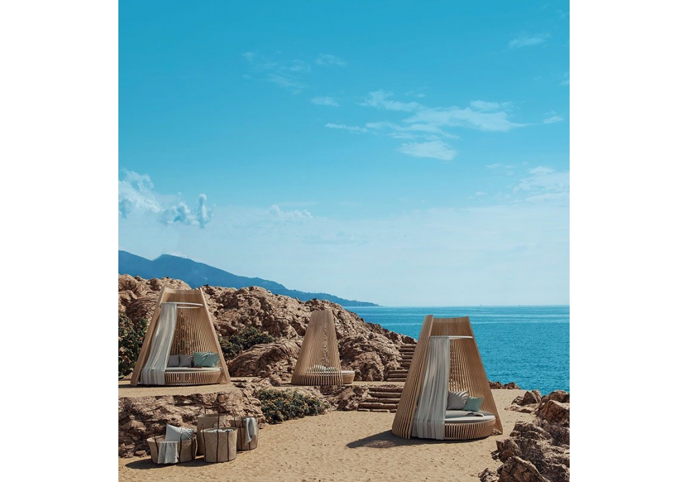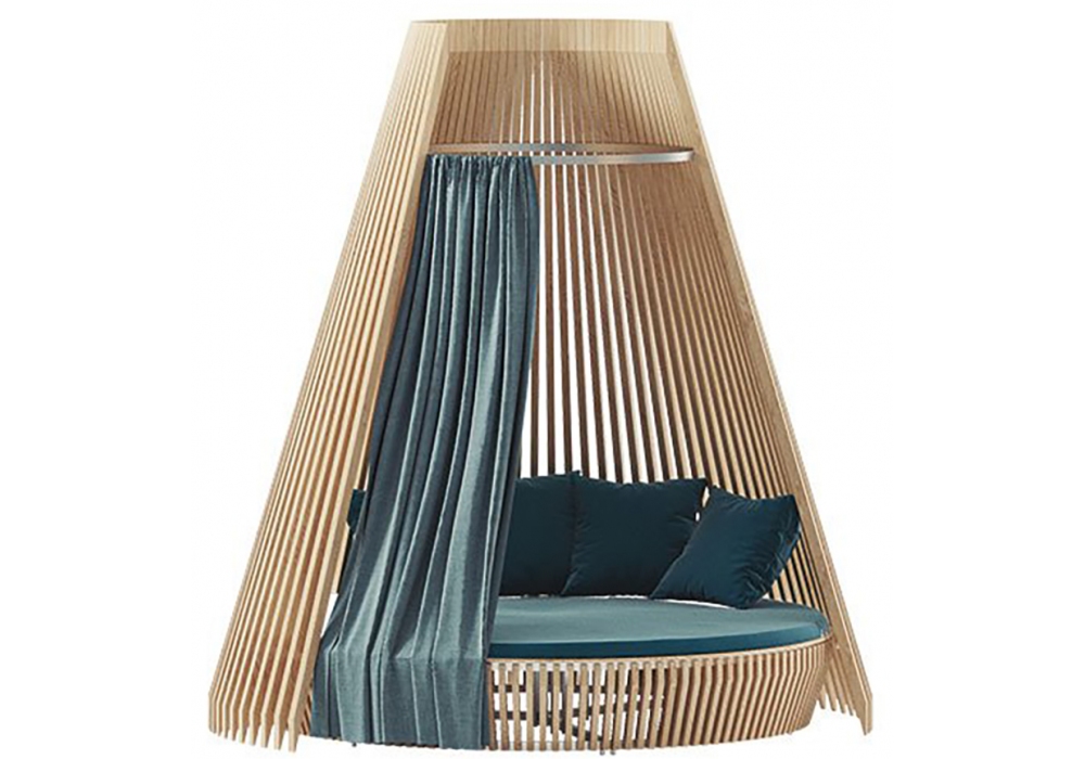 Hut diseñado por Marco Lavit para Ethimo es un diván con estructura en aluminio y madera siberiana Accoya o Larie. Los cojines son de tela disponible en diferentes acabados.