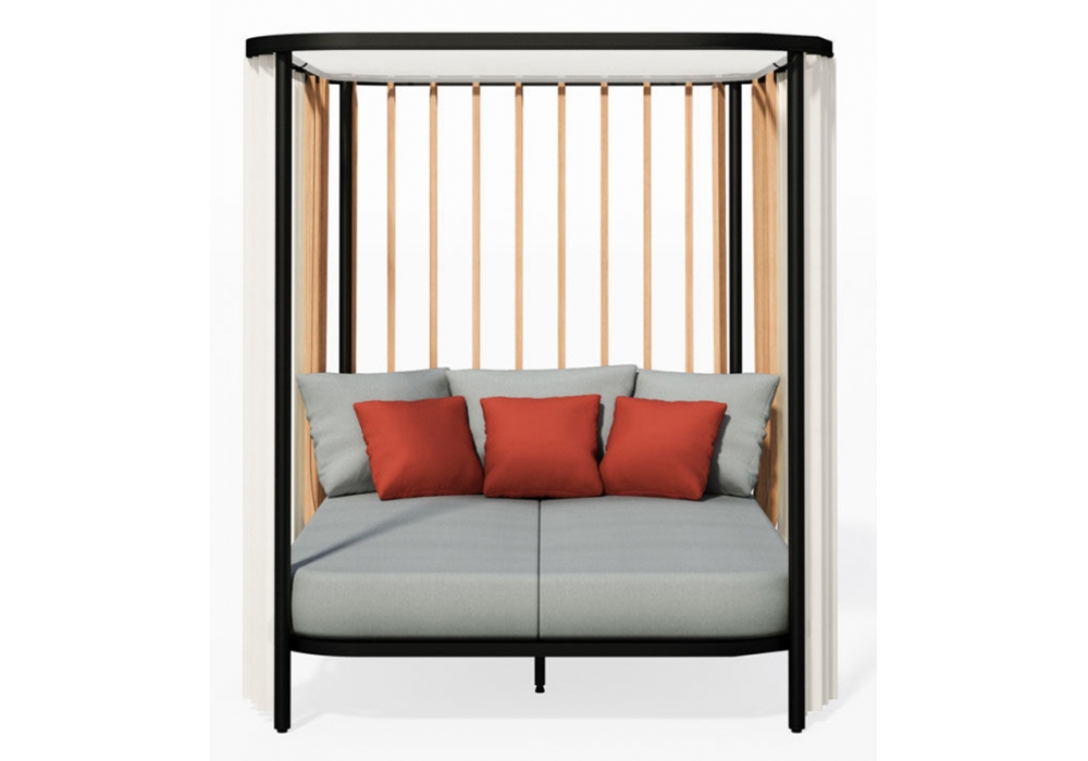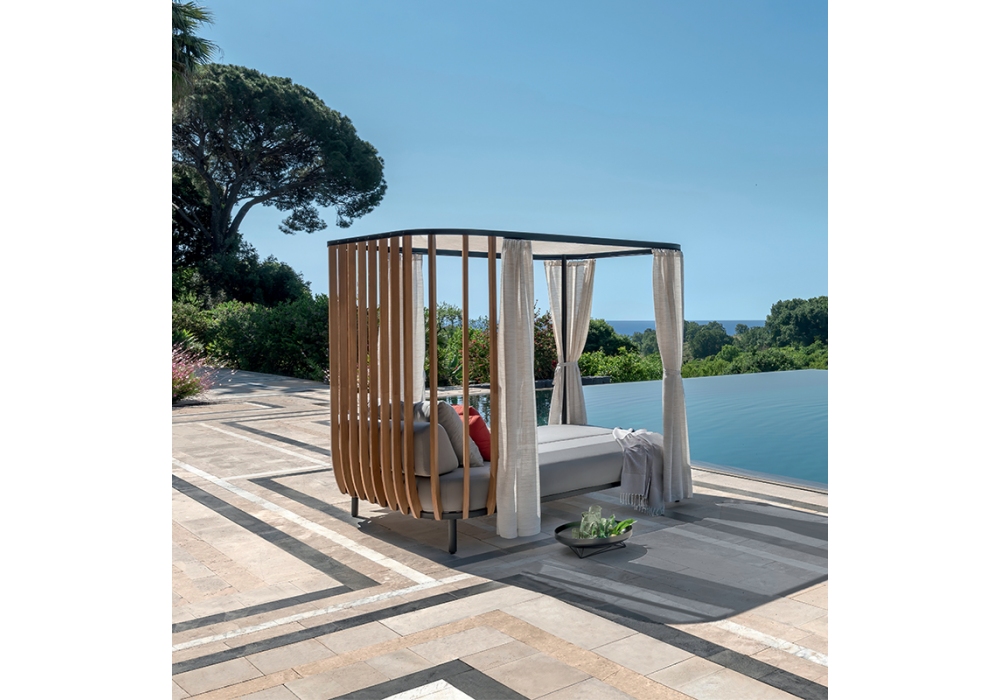 Swing diseñado por Patrick Norguet para Ethimo es un diván con estructura en aluminio pintado y madera de teca. Los cojines son de tela acrílica. Swing está disponible en diferentes acabados.