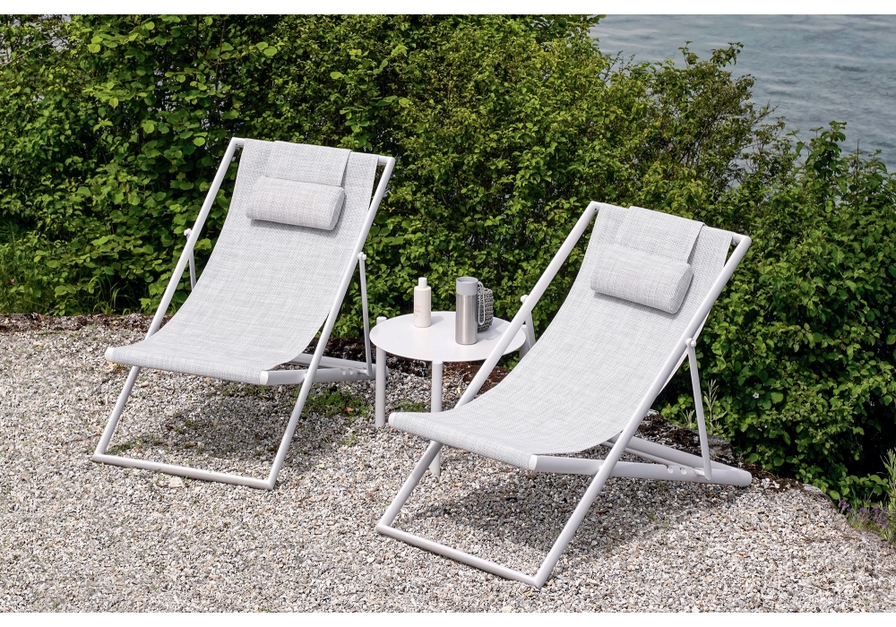 Clever diseñada por R&D para Varaschin es una tumbona plegable con estructura de aluminio pintado en polvo, asientos y respaldos en VAR#TEX (tejido técnico de PVC). Reposacabezas integrado incluido.