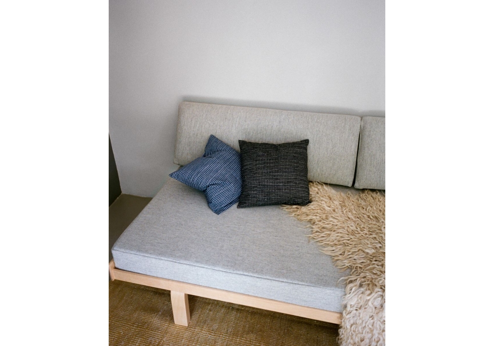 Day Bed 710 diseñada por Alvar Aalto para Artek es una dormeuse realizada con patas, armazón de cama y listones en abedul macizo lacado y cojines de colchón y respaldo tapizados en tela. Deslizadores de fieltro montados.