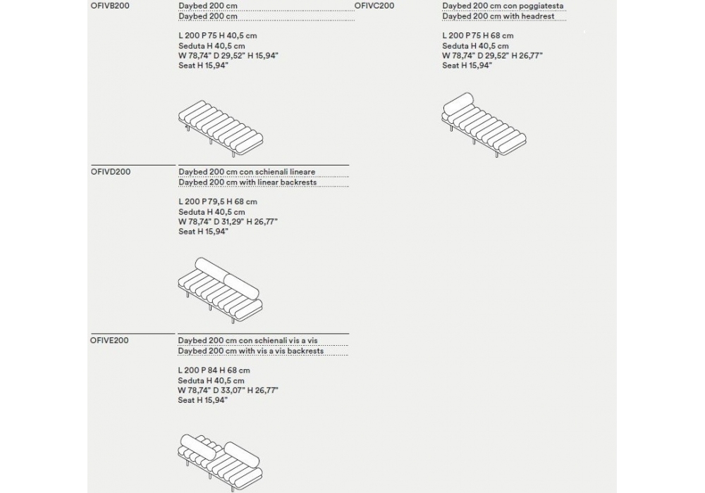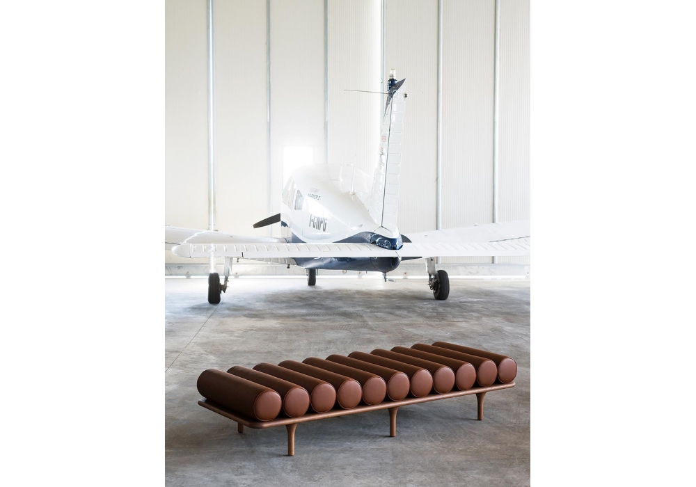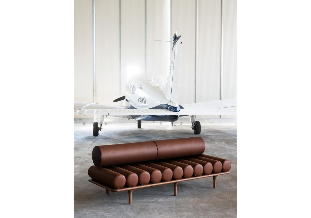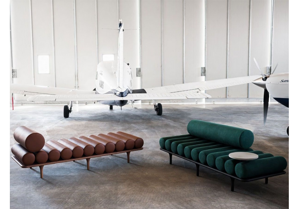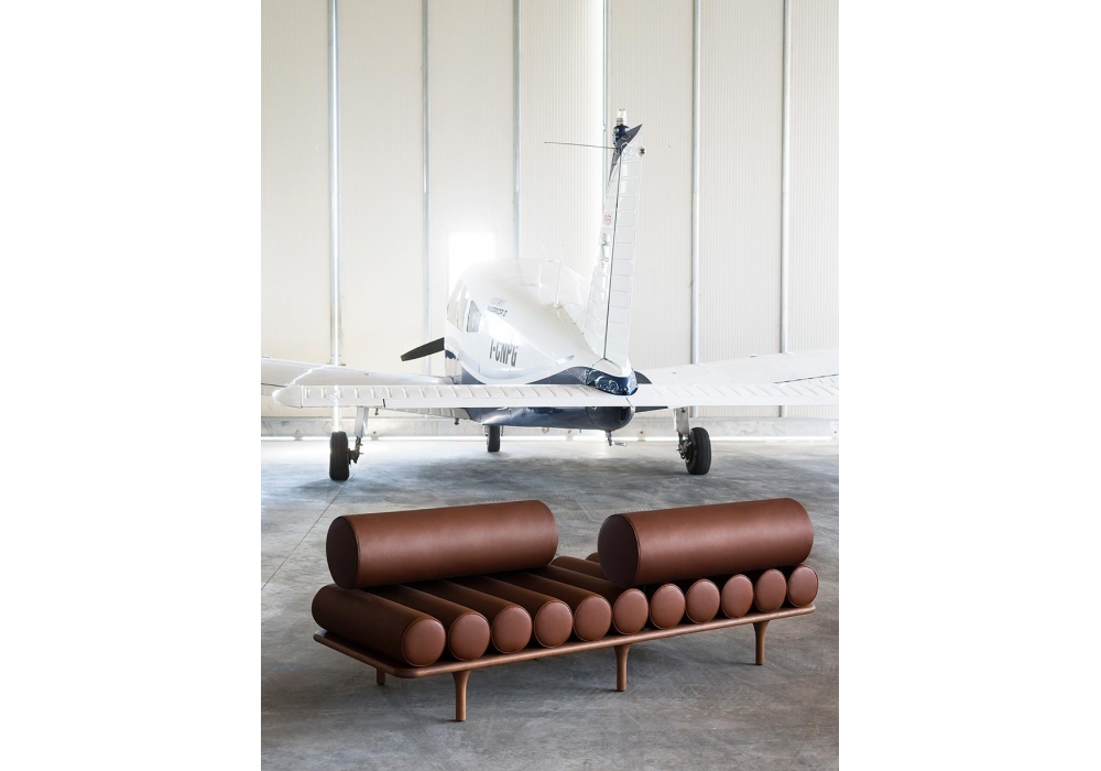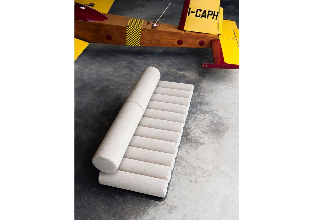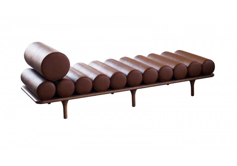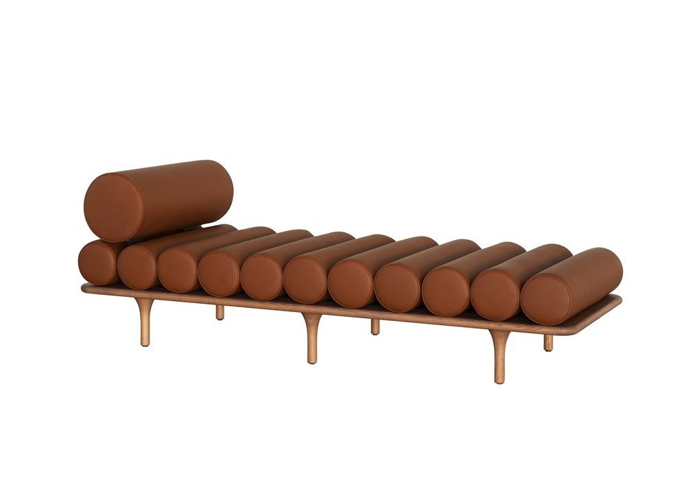 Five to Nine diseñado por Studiopepe para Tacchini es un daybed con base en madera de fresno, disponible en 2 acabados, compuesto por cojines rollo con revestimiento en tejido o piel. También disponible en diferentes modelos.