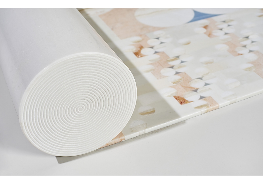 Ballon diseñado por Patricia Urquiola para Budri es un empapelado compuesto por incrustaciones de pared, elemento curvo y suelo. Rollo de mármol en Bianco Lasa completa la realización. Micro patrón solo bajo pedido.