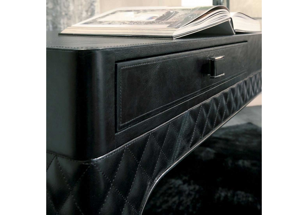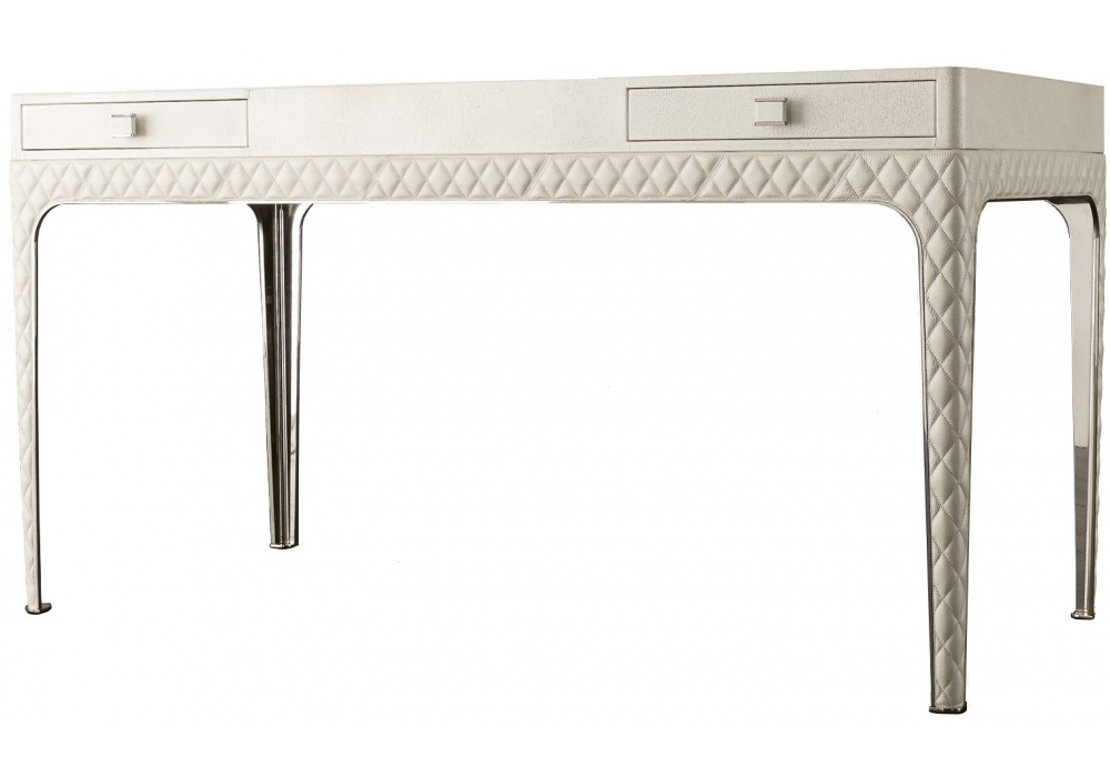 Coline diseñado por Rugiano es un escritorio revestido en piel con dos cajones. Detalles en acero o bronce. Disponible en varios tamaños.