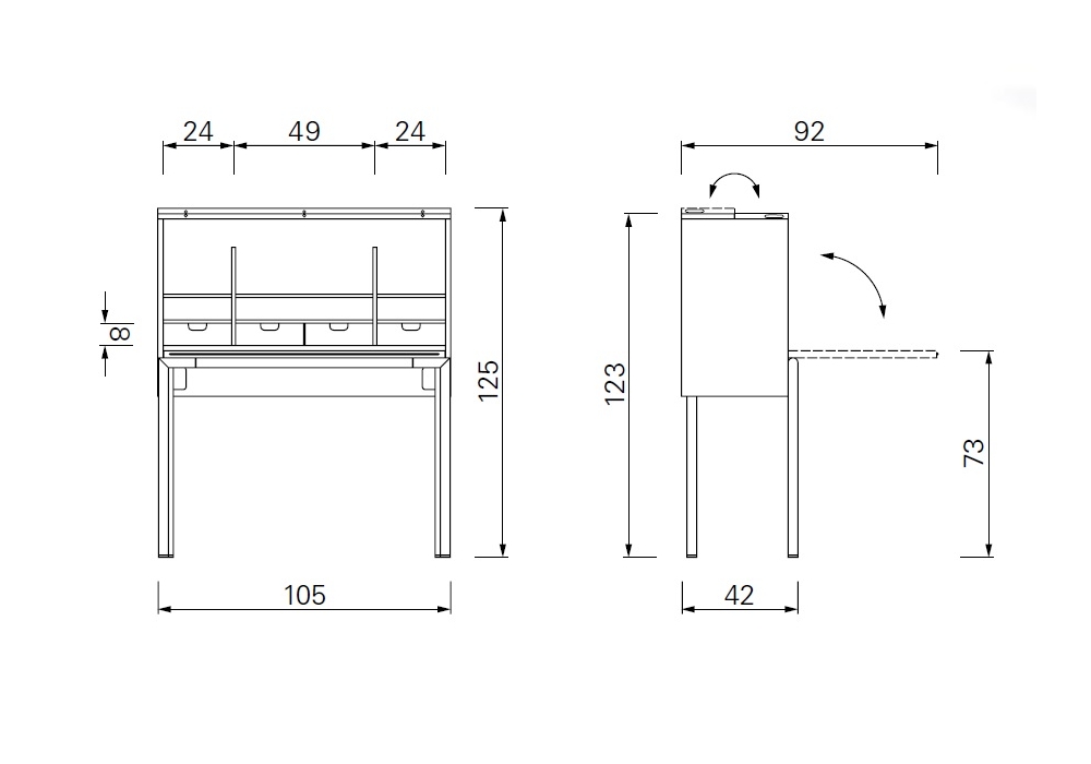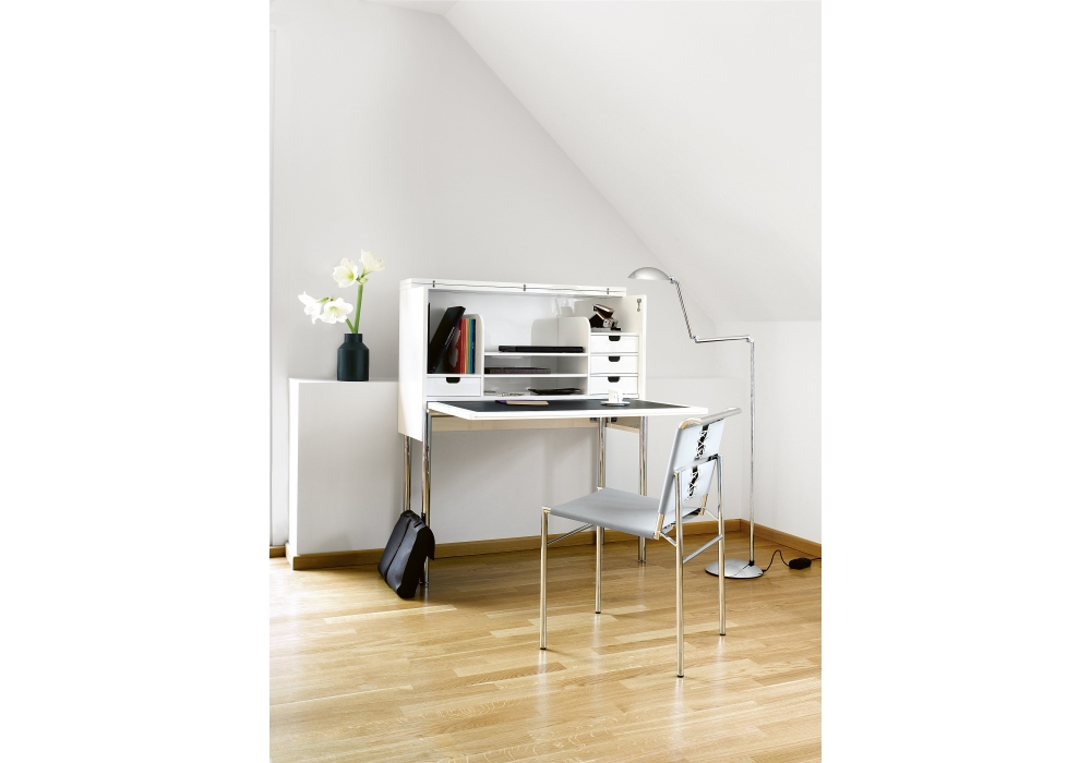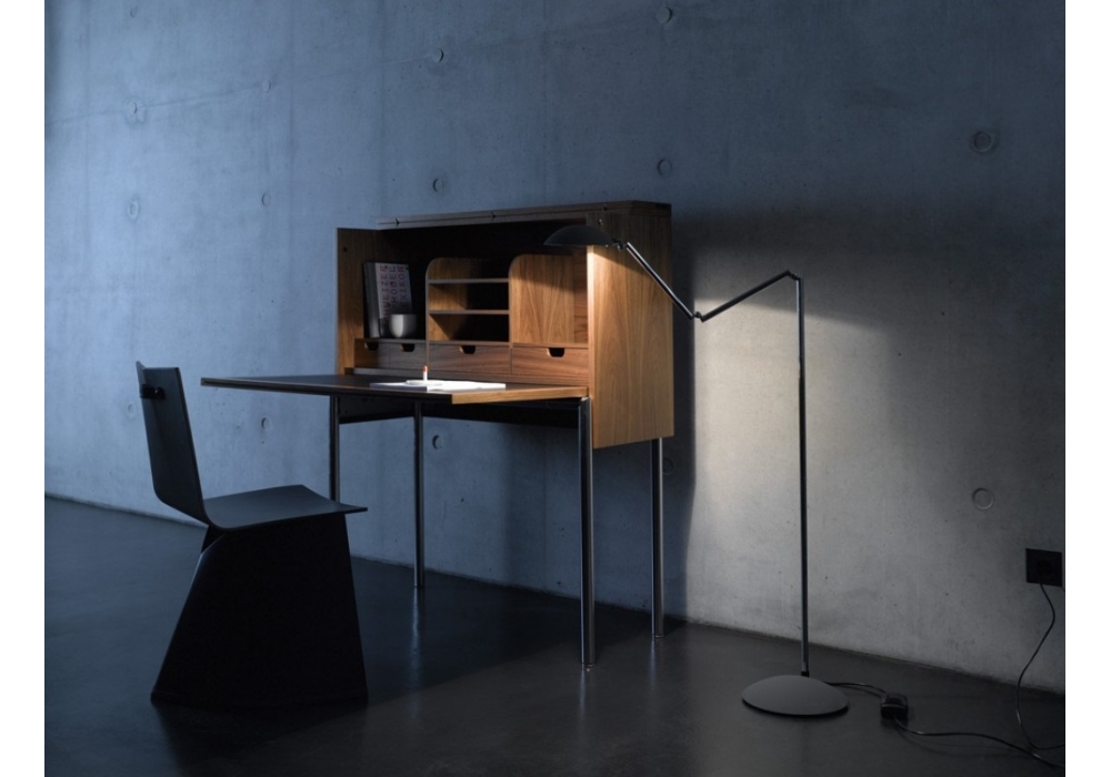 Orcus diseñado por Konstantin Grcic para ClassiCon es un secreter de MDF y multietrato. Chapa de madera o en laca de brillo intenso. Superficie de trabajo plegable, cuatro cajones, estante secreto, compartimento para guardar cables y bloques de alimentación.Cerrable. Estantes parcialmente telescópicos o ajustables. Estructura de acero cromado. Patillas ajustables.