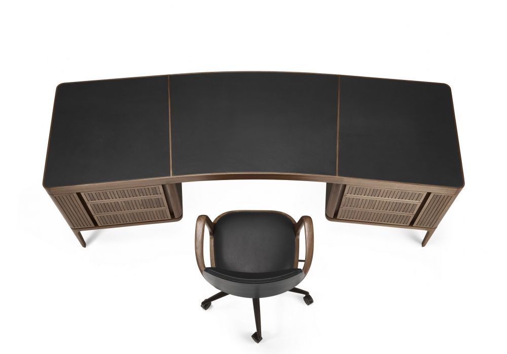 Paperweight diseñado por Roberto Lazzeroni para Ceccotti Collezioni es un escritorio de nogal americano macizo y contrachapado de nogal americano, seis cajones y dos puertas laterales, superficie en piel. Bajo pedido, superficie de madera.