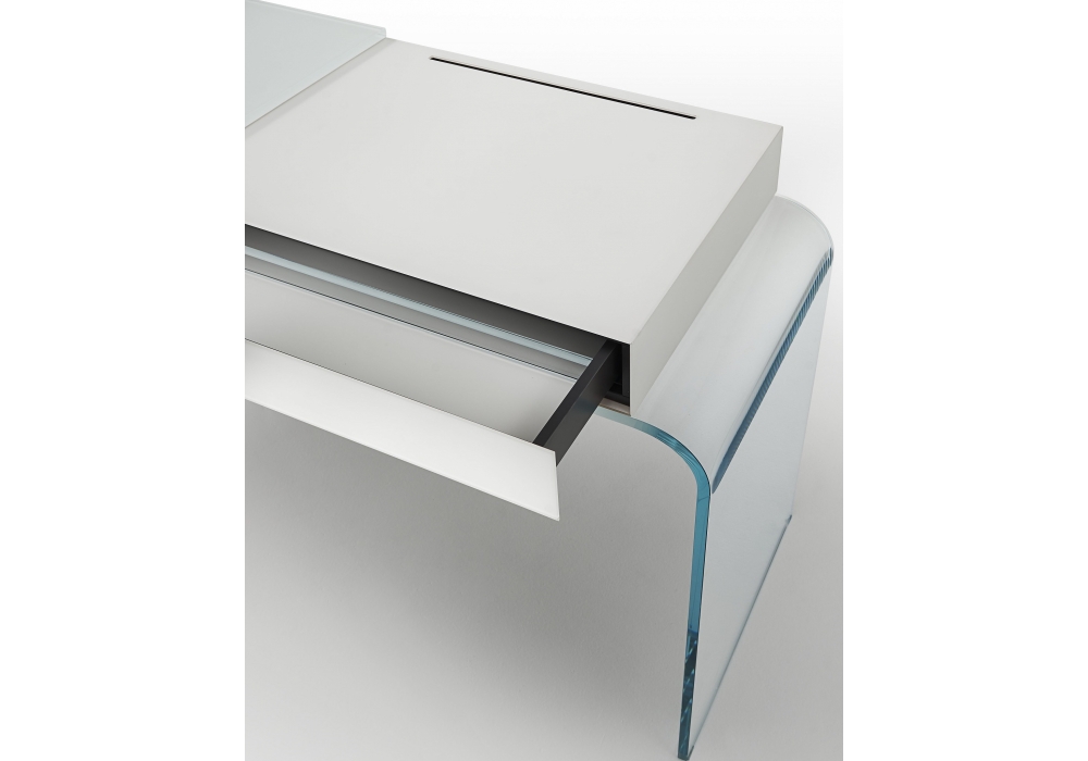 Strata, diseñado por Yabu Pushelberg para Glas Italia, es un escritorio con patas curvas de cristal extraclaro. El tablero está revestido de cristal templado lacado brillante o mate y cuenta con un cajón con sistema push-pull. El tablero cuenta con una ranura para la gestión de cables, en la que se puede insertar un espejo de doble cara.