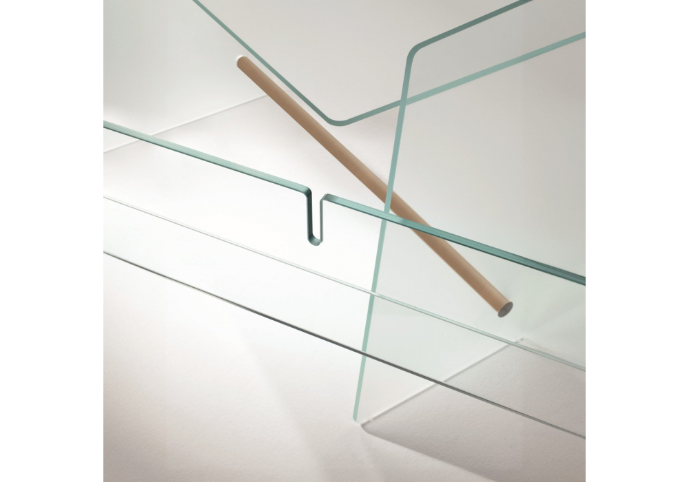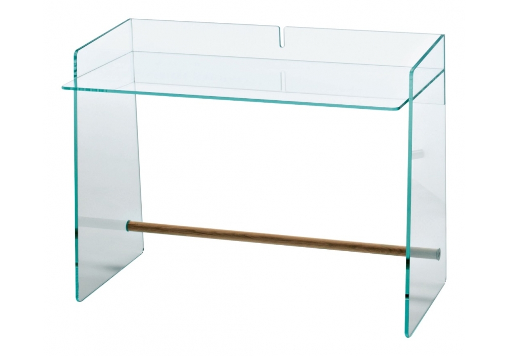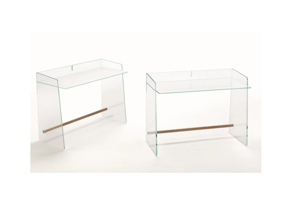 Pirandello diseñado por Jasper Morrison para Glas Italia es un escritorio en vidrio transparente extraligero, templado y termosellado, disponible en dos tamaños diferentes. Está equipado con una barra reposapiés en madera de fresno natural.