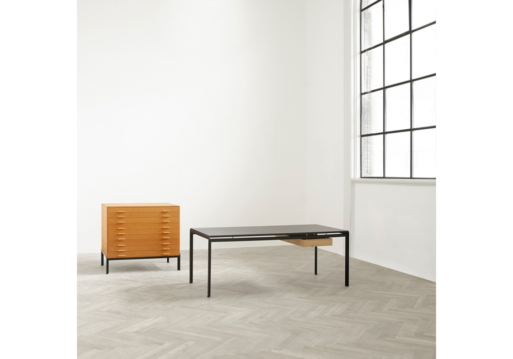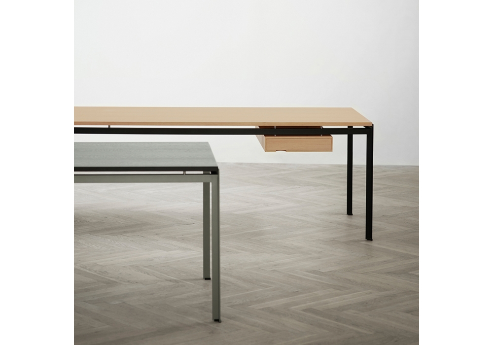 PK52 Professor Desk diseñado por Poul Kjærholm para Carl Hansen & Søn, es un escritorio con estructura de acero con revestimiento en polvo negro. El tablero está disponible en chapa de roble en varios acabados. Disponible con o sin cajón.
