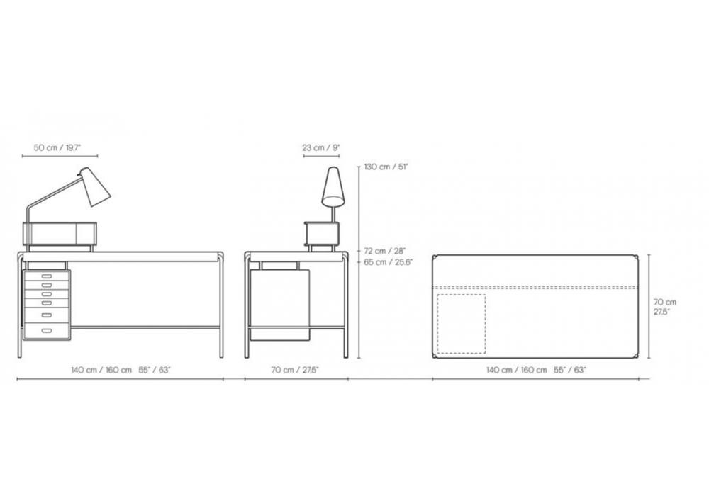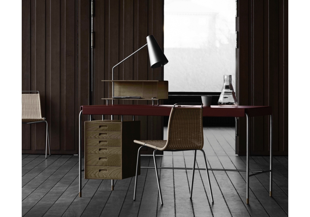 AJ52 Society Table diseñado por Arne Jacobsen para Carl Hansen & Søn es un escritorio con estructura en acero, patas de madera, tablero con revestimiento en piel y cajones en madera de roble o nogal. Contenedor de madera y vidrio con lámpara de acero. Disponible en dos dimensiones.