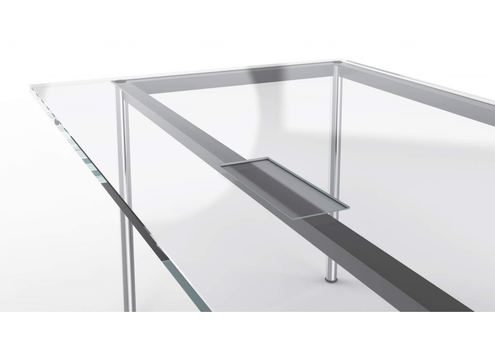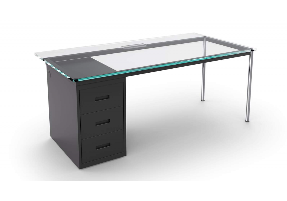 10 Bureau de la Semaine à Paris diseñado por Le Corbusier, Pierre Jeanneret, Charlotte Perriand para Cassina es un escritorio realizado con superficie de vidrio flotado, patas cromadas y estructura pintada. Cajonera con 3 cajones y compartimento técnico, lista para cableado, en acero pintado antracita.