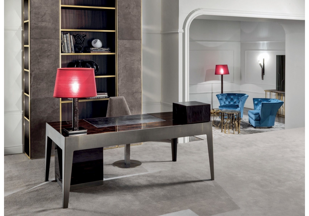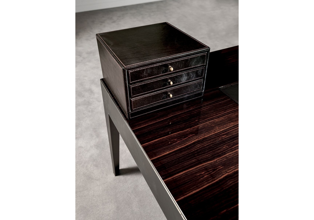Gorky diseñado por Giuseppe Viganò para Longhi es un escritorio con base de metal rectificado con cajón, tablero de madera o lacado brillante con inserto de cuero y mini cómoda a juego. Cajonera en el mismo acabado que el escritorio con cajones frontales revestidos en piel. Bajo pedido también está disponible sin cajoneras.