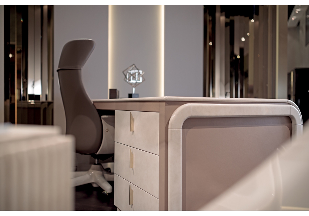 Eclipse diseñado por Andrea Bonini para Turri es un escritorio con estructura en MDF, madera maciza y paneles de aglomerado en acabado lacado brillo y revestimiento en piel. Detalles decorativos y tiradores en metal dorado. Hay tres cajones con forro de microfibra.