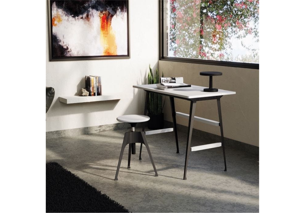 Portable Atelier diseñado por Philippe Nigro para Driade es un escritorio con tablero en tablero de partículas barnizado con acabado mate. Una parte de la parte superior se puede abrir a "solapa" para tener acceso a un "baño" de contención preparado con ranuras para el paso de tomas eléctricas y cables de conexión de PC. Travesaños que conectan las patas en haya lacada en negro a juego con la tapa.
