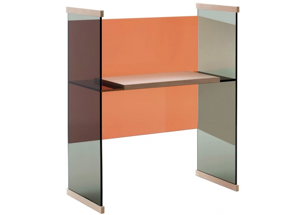 Diapositive diseñado por Ronan & Erwan Bouroullec para Glas Italia es un escritorio alto en vidrio laminado extralight y termosellado, disponible en diferentes acabados. Los elementos fijados a los extremos de los laterales de apoyo y la tapa están disponibles en fresno natural o roble oscuro. El escritorio, opcionalmente, puede equiparse con un pasacables.