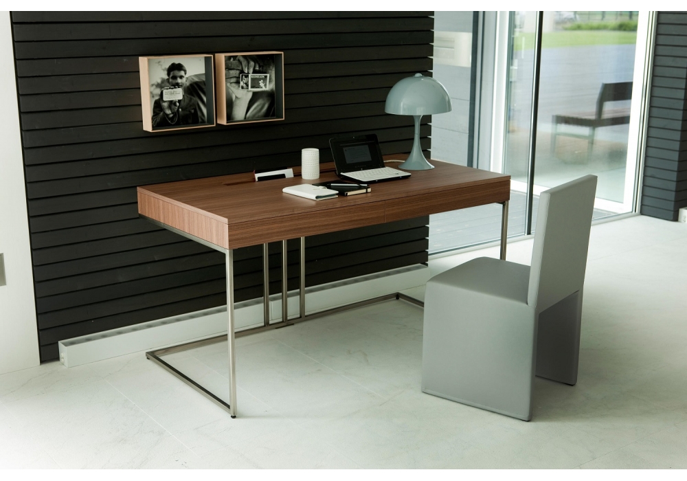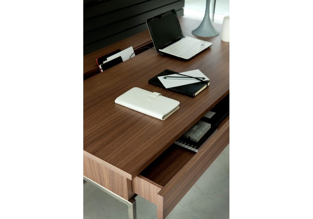 Kepler diseñado por G. Azzarello para Porada es un escritorio realizado en nogal canaletta disponible en diferentes acabados con dos cajones, hueco portaobjetos, agujero pasacables y estructura en metal.