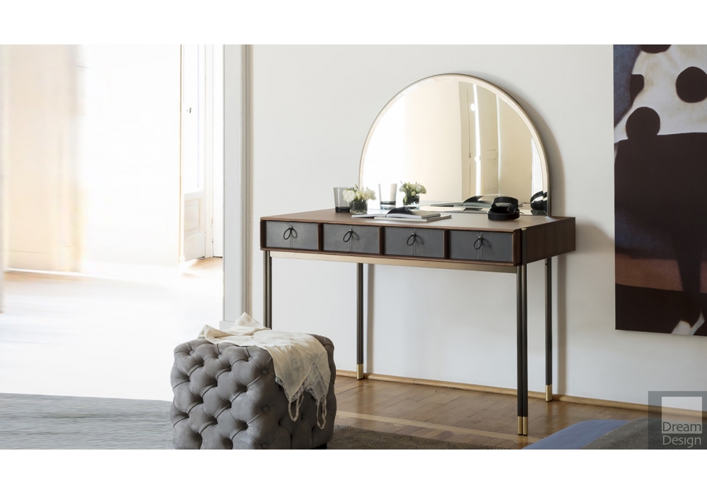 Eley diseñada por Gabriele & Oscar Buratti para Porada es un escritorio en nogal canaletta con cuatro cajones revestidos en cuero cuoio. Bordes superiores y compartimentos divisores en nuez canaletta sólida. Base en metal bronzoro y puntales en latón cepillado. Espejo Eley, con marco de metal bronzoro y panel posterior en nogal canaletta, incluido.