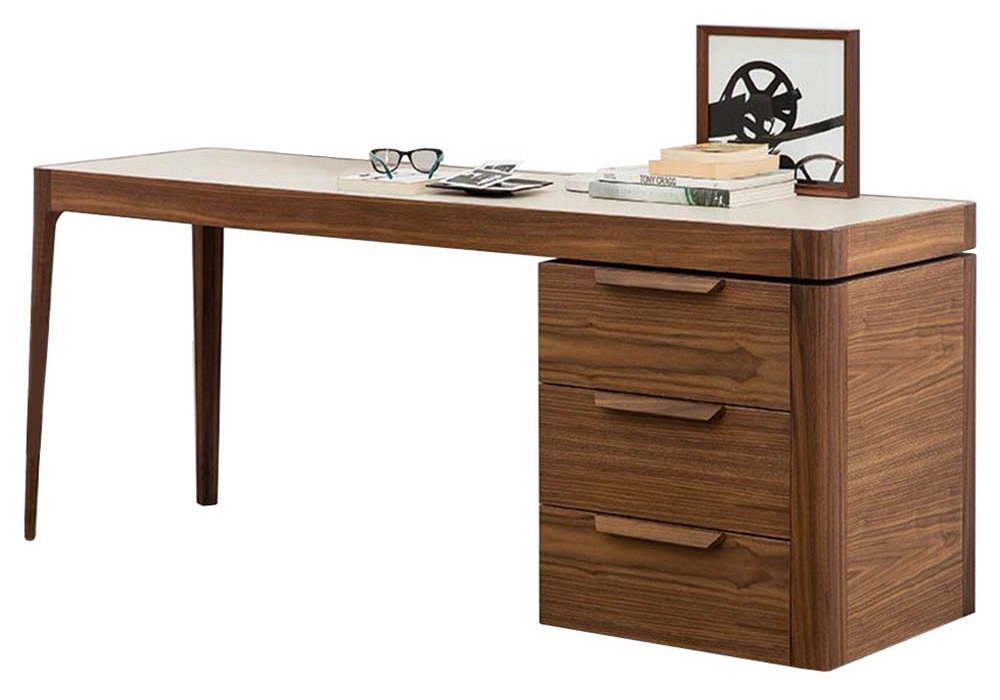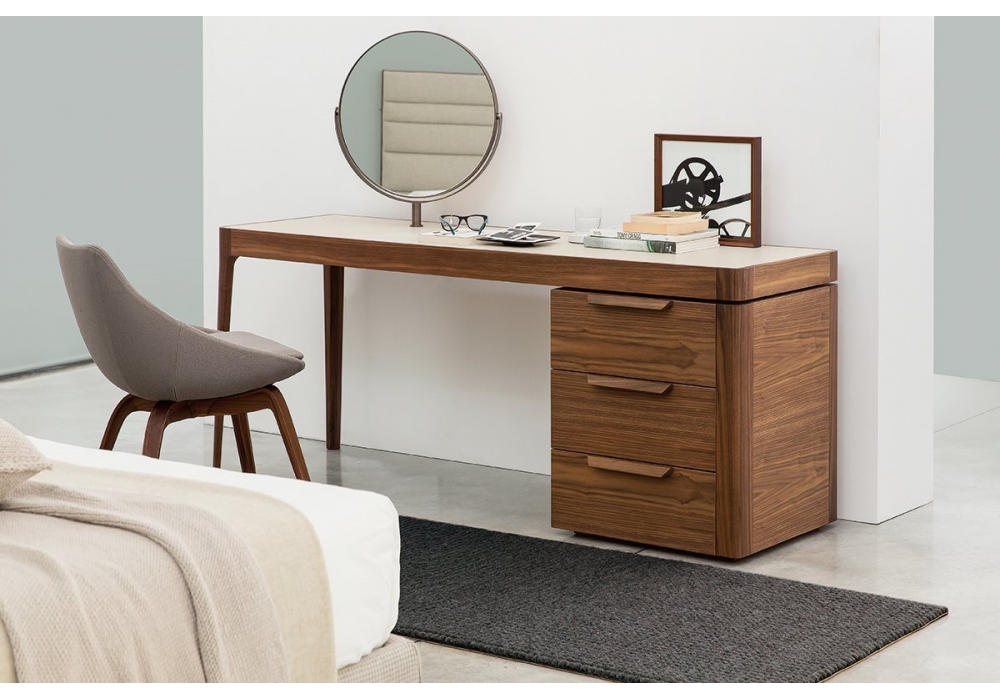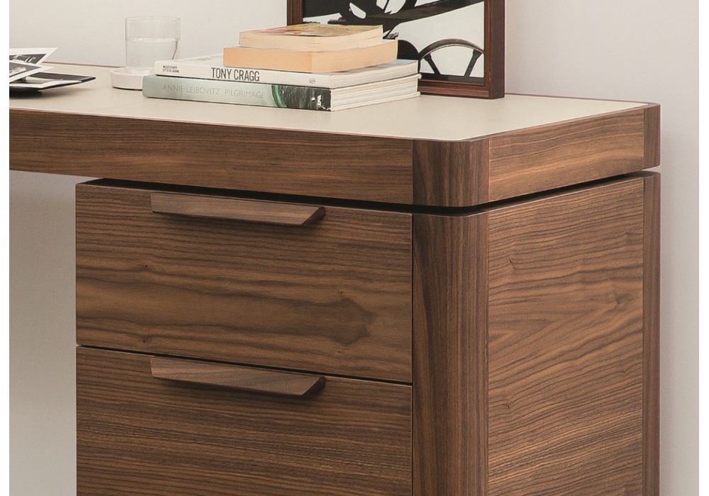 Afrodite diseñado por C. Ballabio para Porada es un escritorio con estructura y cajones laterales en nogal canaletta macizo disponible en diferentes acabados. Tapa en mármol, madera, cristal o en cuoietto. Disponible con cajones a la derecha o a la izquierda. Posibilidad de añadir un elemento en espejo en la versión con tapa en madera y en cuoietto.