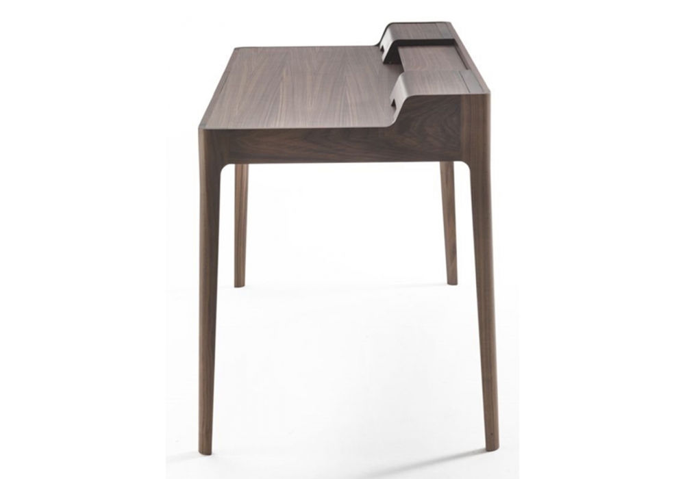 Saffo diseñado por Carlo Ballabio para Porada es un escritorio con cajón en nogal canaletta macizo, portaobjetos y pasacables. Almohadilla en cuoietto disponible en diferentes acabados.