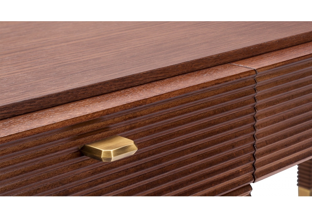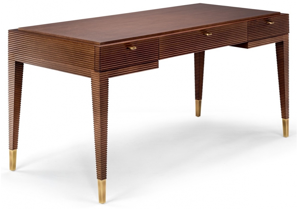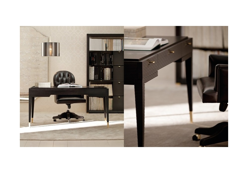 Dimitri diseñado por Castello Lagravinese Studio para Opera Contemporary es un escritorio con 3 cajones, disponible en diferentes acabados con manijas y pies de metal.