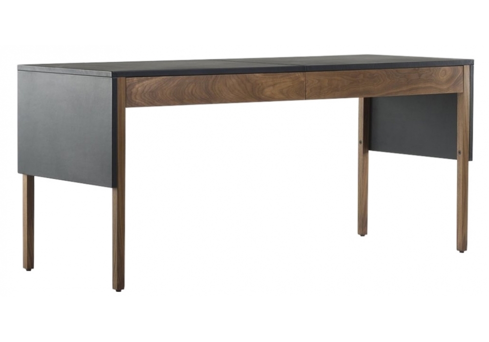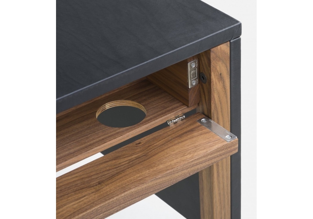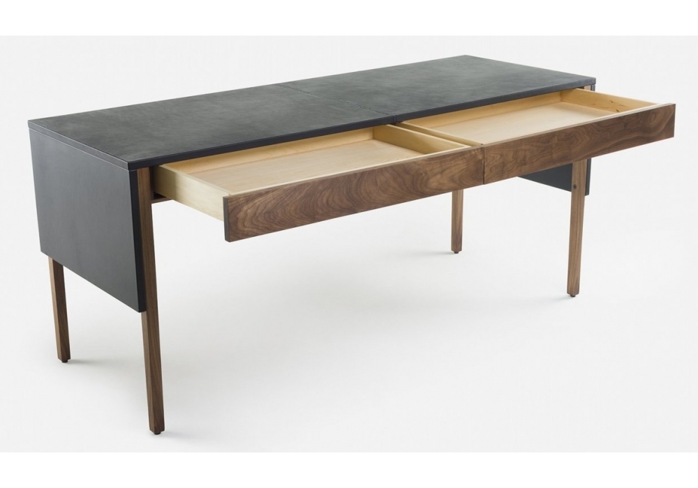 Drape diseñado por Neri & Hu para De La Espada es un escritorio con 2 cajones y estructura en madera disponible en diferentes acabados. Superficie tapizada en piel.