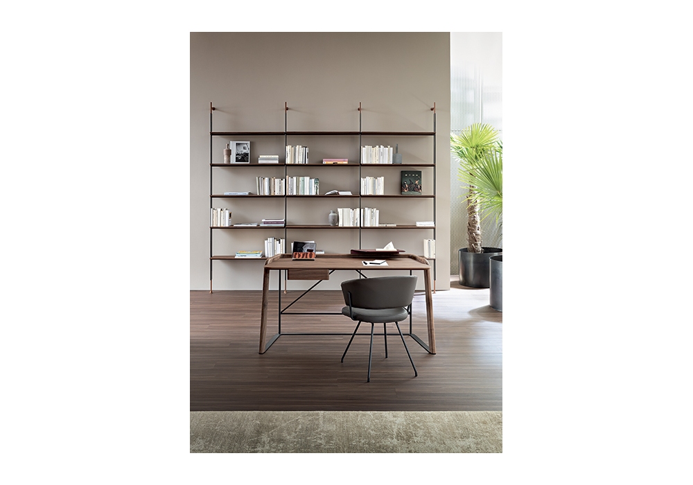 Scriba diseñada por Mauro Lipparini para Bonaldo es un escritorio con tapa de madera y patas delanteras. La estructura metálica está disponible en diferentes variantes. Es posible añadir una balda de piel en varios colores (consultar con nuestro Servicio de Atención al Cliente).