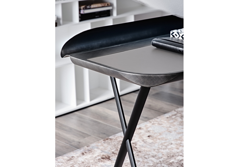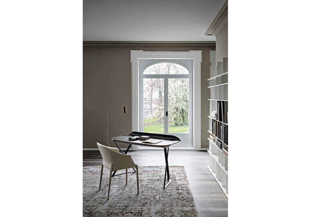 Cocoon Leather diseñado por Paolo Cattelan para Cattelan Italia es un escritorio realizado con base de acero barnizado. Sobre en cuero en varios colores con perfil inferior redondeado barnizado Brushed Bronze o Brushed Grey y bandeja portaobjetos en metal barnizado Brusehd Bronze o Brushed Grey.
