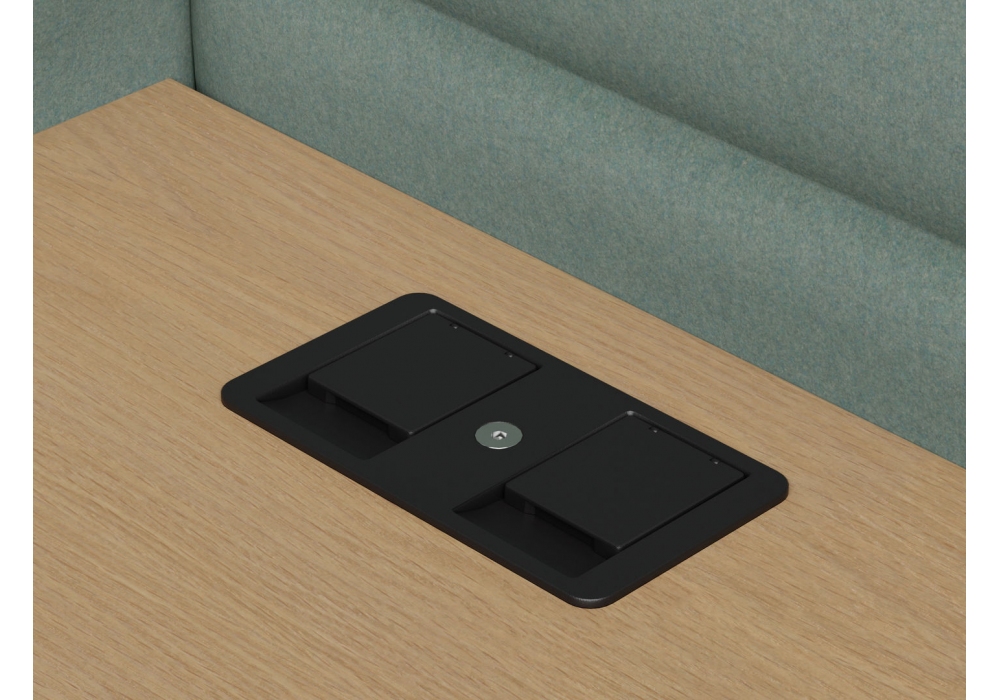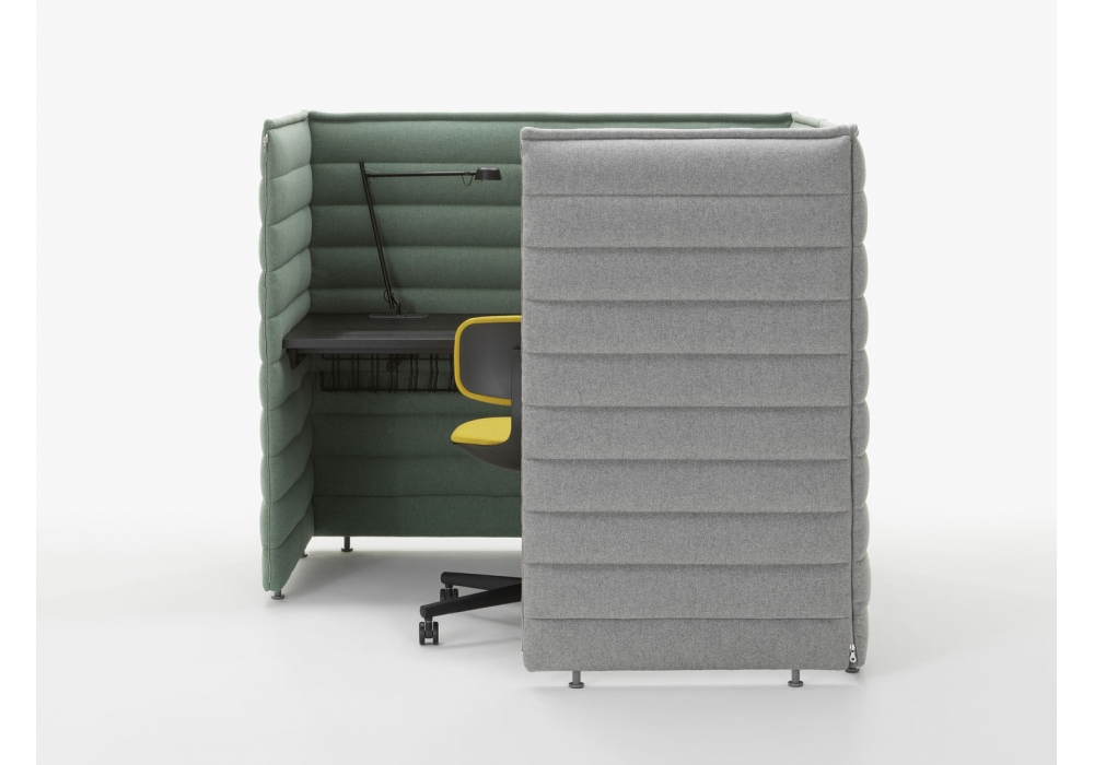 Alcove Plus Desk diseñado por Ronan & Erwan Bouroullec para Vitra es un escritorio realizado con paneles laterales y traseros en fibra biológica y estructura metálica, conectados por bisagras. Sobre en MDF, melamina o roble. Tapicería de tela extraíble. A petición es posible añadir otros paneles y accesorios que completen el escritorio.