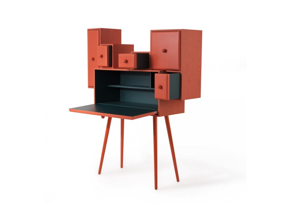 Confidence of a Cloud diseñado por Thomas Dariel para Maison Dada es un escritorio compuesto por varios elementos cuadrangulares estructurados en MDF revestido con chapa de fresno pintado en diferentes acabados. Patas en metal chapado en fresno pintado en diferentes colores.