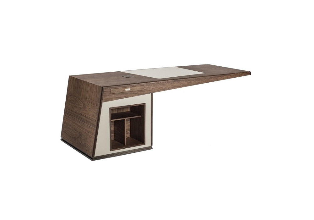Midì diseñado por Umberto Asnago para Porada es un escritorio en nogal Canaletta con tablero con inserto de cuero Cuoietto y pasacables electrificado con toma Schuko y dos tomas USB. Contenedor lateral de madera con inserciones de cuero Cuoietto, equipado en el interior con un estante extraíble para lápices, dos cajones y un porta carpetas con cierre lento y en el exterior con un estante extraíble y compartimentos abiertos.