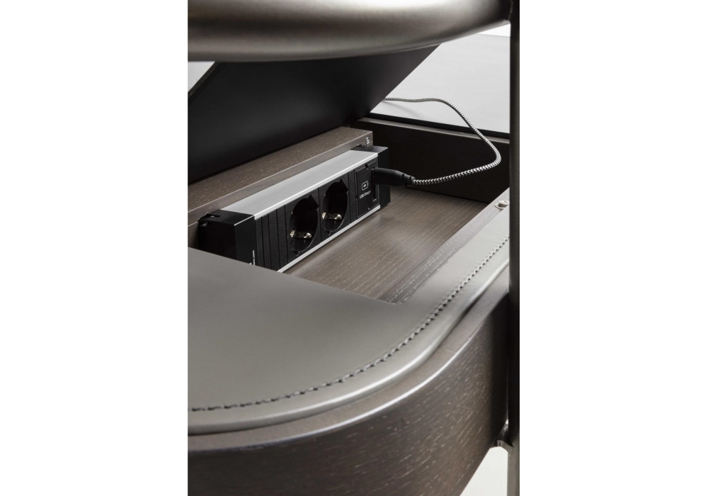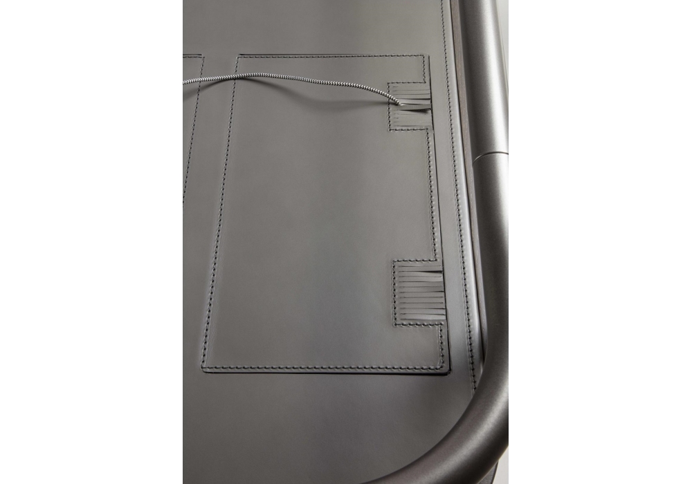 Raily diseñado por Studio Nove.3 para Enrico Pellizzoni es un escritorio con estructura tubular de metal pintado y tapa de madera con superficie revestida de cuero. La parte superior está disponible en la versión estándar o con accesorios adicionales.