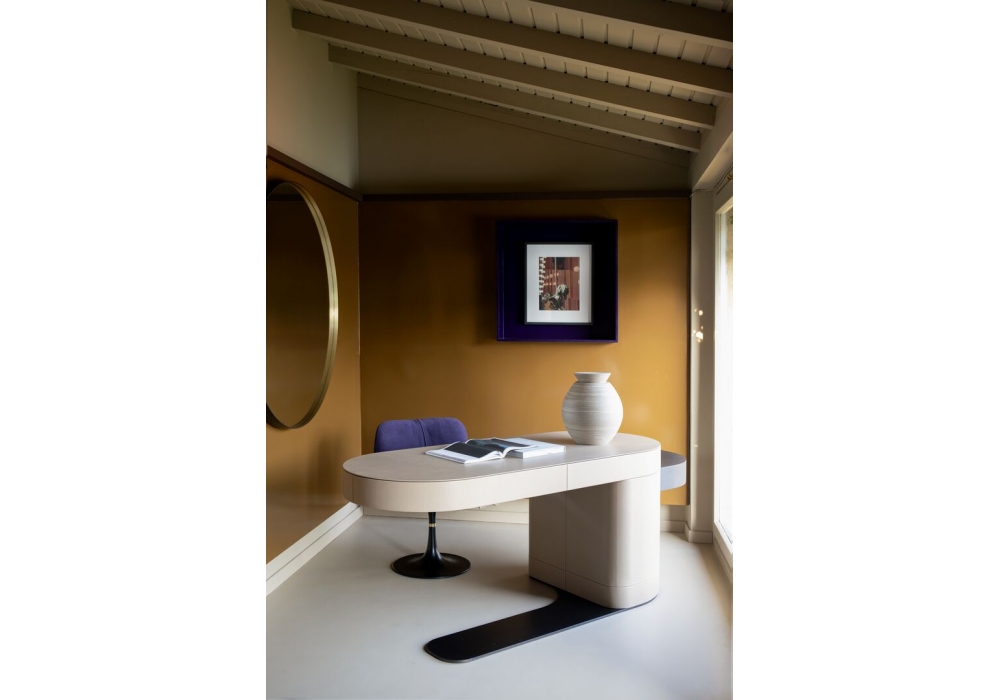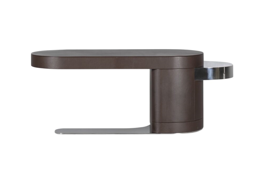 Blend diseñado por Federico Peri para Baxter es un escritorio con estructura en contrachapado de abedul y MDF revestido en piel. Interior en roble cepillado teñido en diferentes tonos. El escritorio Blend se desarrolla en torno a una sola pata de apoyo, con un tablero que parece extenderse con ligereza natural. El volumen curvo integra discretos espacios de almacenamiento, ocultos en una estructura fluida que combina solidez y movimiento. El contraste entre materiales y acabados amplifica el dinamismo del diseño, realzando la fusión entre estética y funcionalidad.