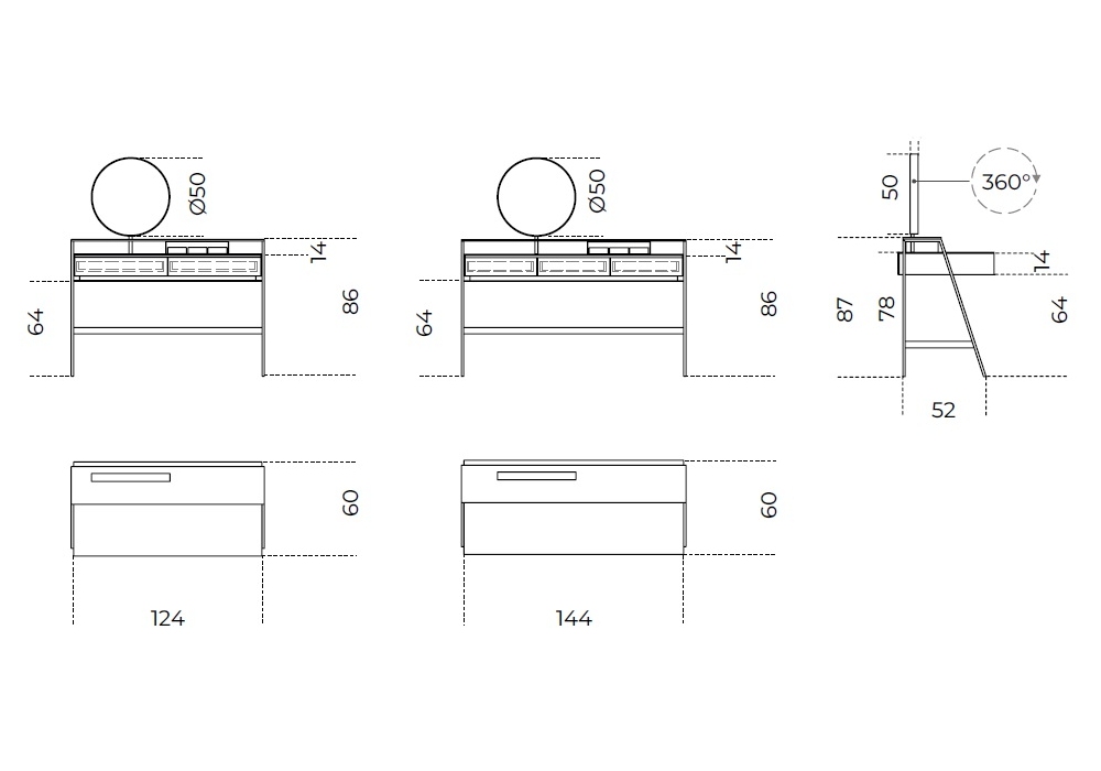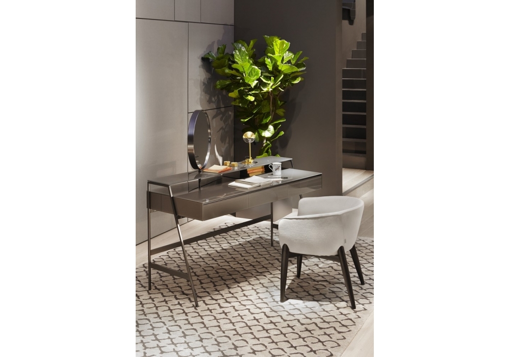 Venere diseñado por Carlo Colombo para Gallotti&Radice es un escritorio de vanidad cubierto por cristal pintado, según muestras en la versión brillante o versión del satén. La doble cara ajustable refleja diam. 50 cm. Castaño con el efecto de toque "de tela" laqueó cajones. Estructura metálica pulida. Pequeñas cajas en metal cubierto por suede Sand 012.