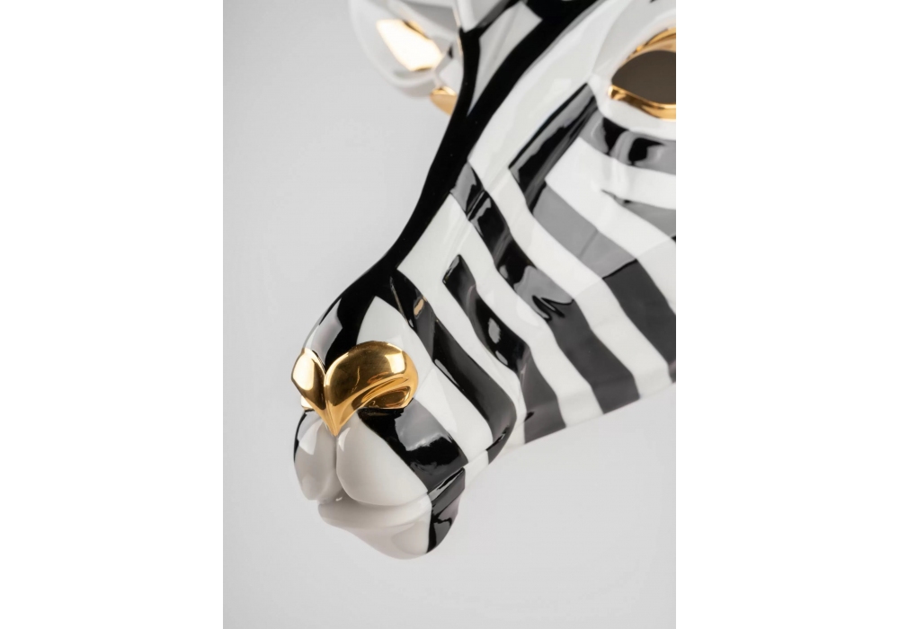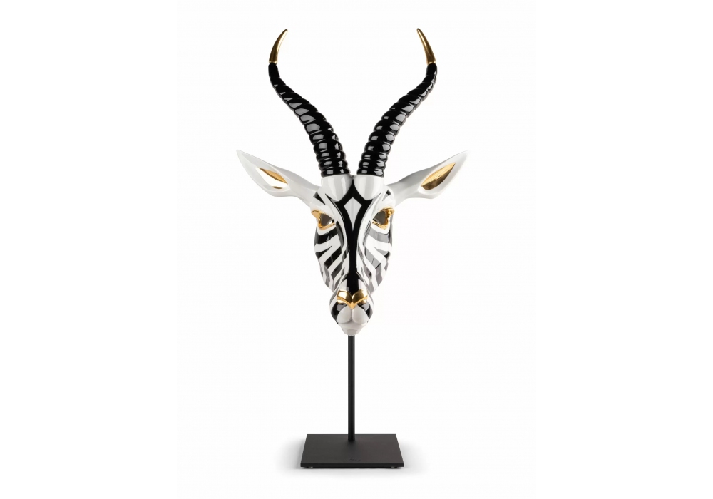 Maschera Antilope esculpida por José Luis Santes para Lladró es una escultura de porcelana brillo negra, blanca y dorada, íntegramente realizada y pintada a mano por los artistas de Lladró.