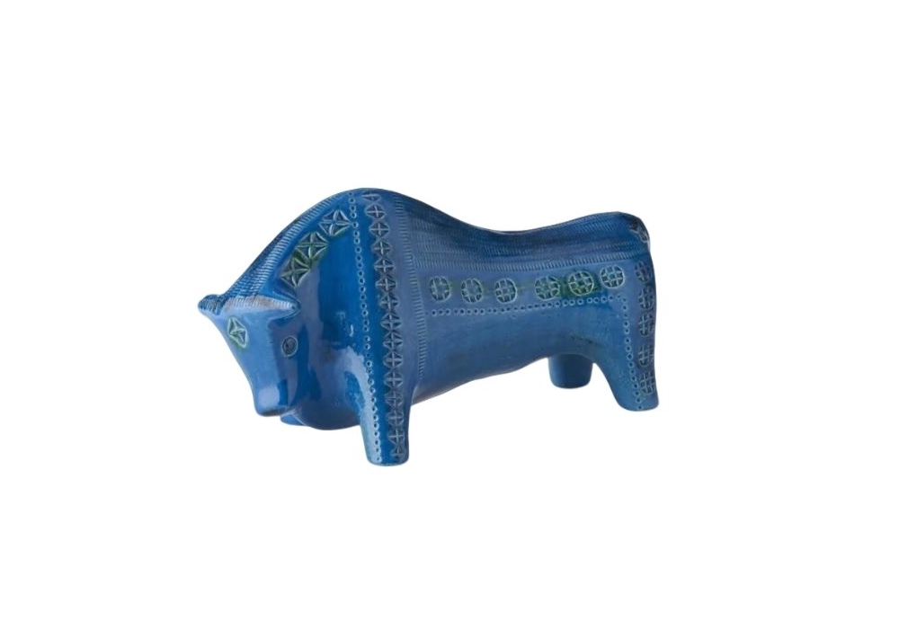 Figura di Toro diseñada por Aldo Londi para Bitossi Ceramics es una escultura realizada a mano en arcilla blanca refractaria y forma parte de la serie Rimini Blu, decoración realizada con grabado manual con plantilla.