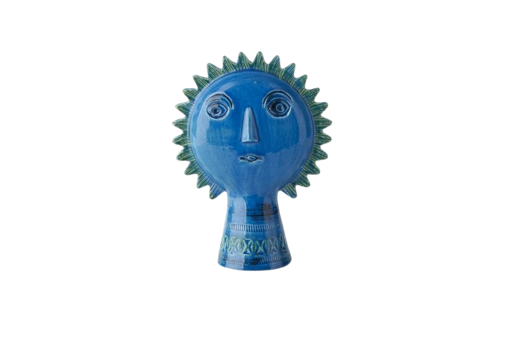 Figura di Sole diseñada por Aldo Londi para Bitossi Ceramiche es una escultura realizada artesanalmente con prensa en arcilla blanca refractaria de la serie Rimini Blu, decorada con grabado.