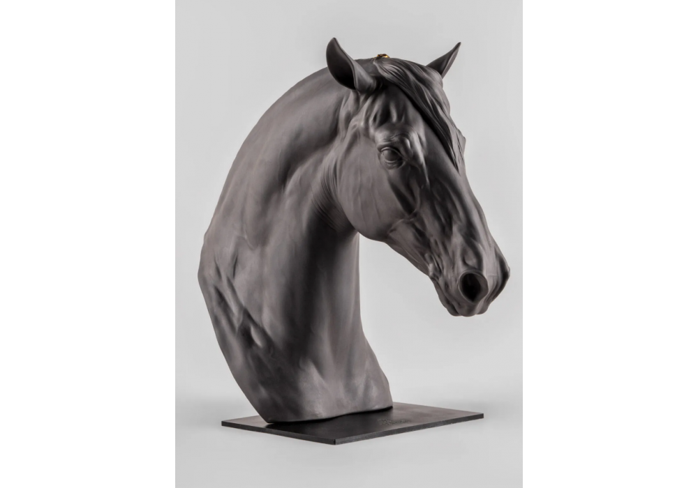 Equinus firmada por Ernest Massuet para Lladró es una escultura en porcelana negra mate con detalles metálicos en color dorado.