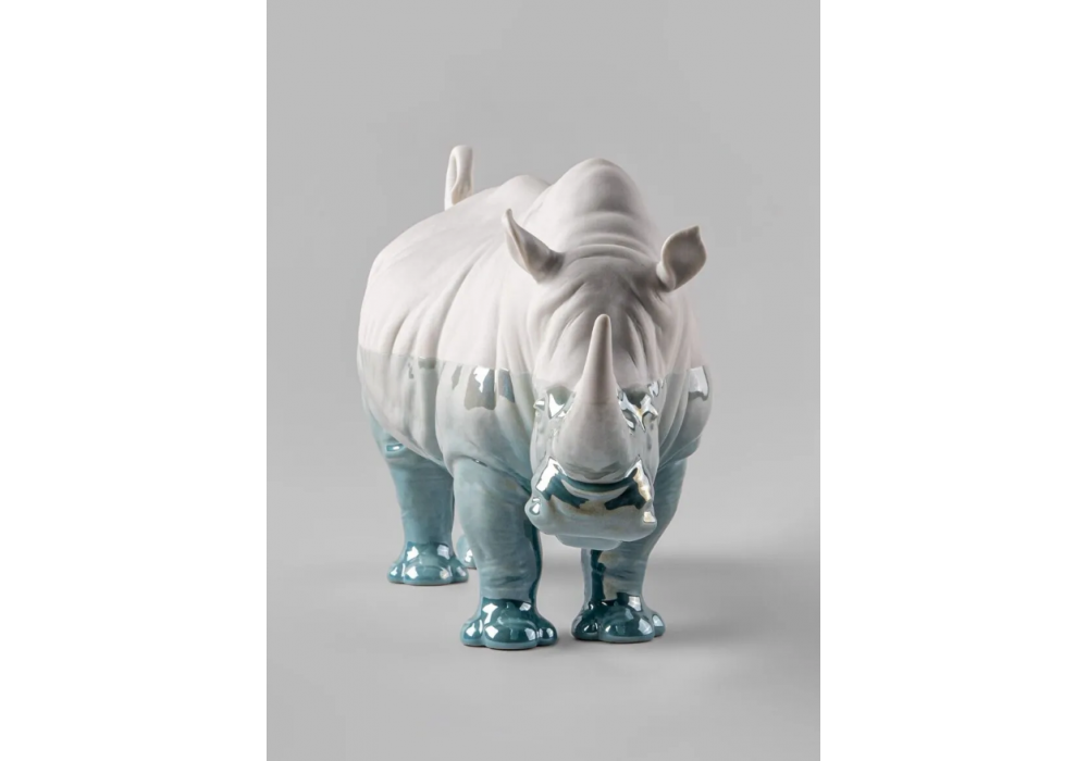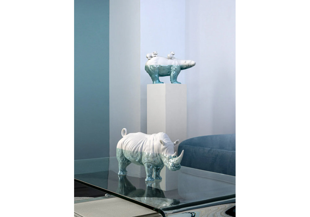 Rhino Underwater diseñada por Ernest Massuet para Lladró es una escultura de porcelana brillante y mate, realizada íntegramente y pintada a mano por los artistas de Lladró.