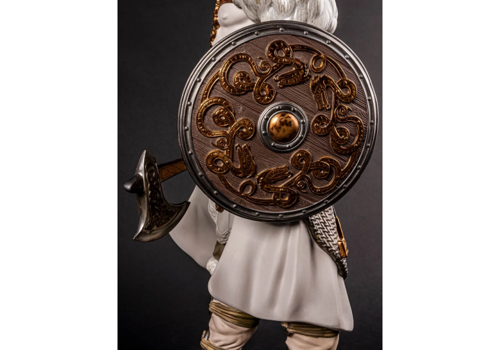 Odin esculpido por José Santaeulalia para Lladró es una escultura de porcelana blanca mate que representa a un dios de la mitología nórdica. Las armas y los detalles son en ocre, plata y oro.