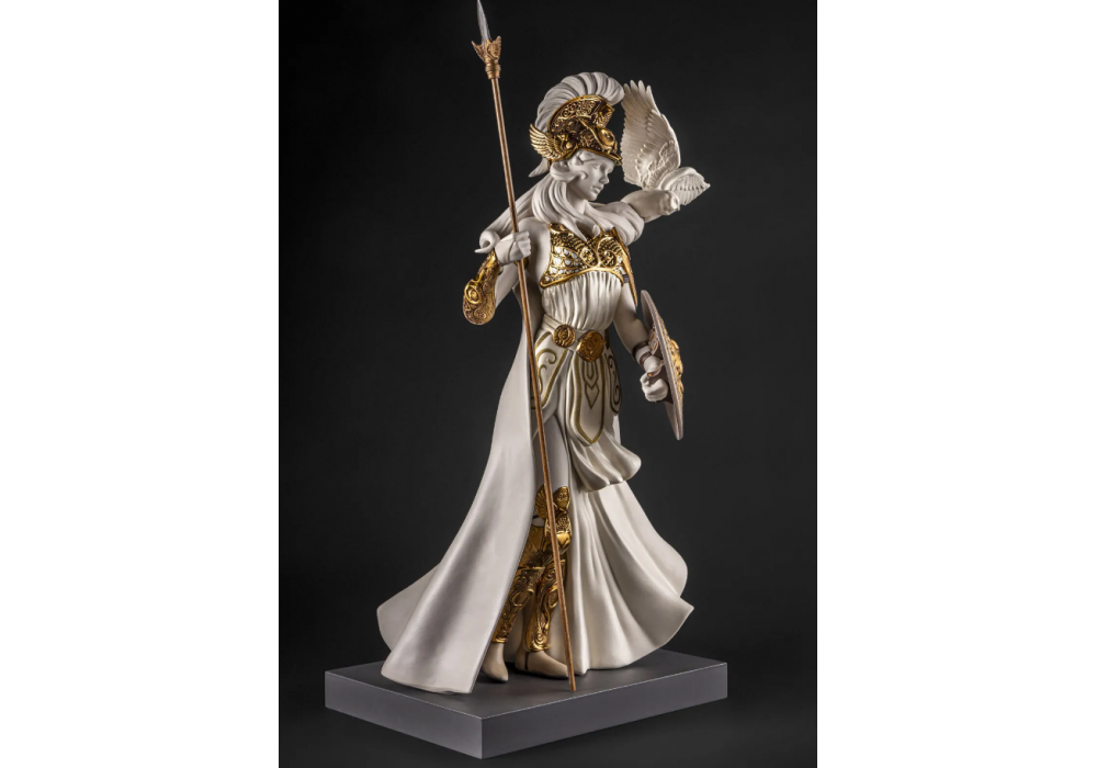 Athena esculpido por José Santaeulalia para Lladró es una escultura de porcelana blanca mate que representa a una diosa de la mitología griega. Las armas y los detalles son en ocre, plata y oro.