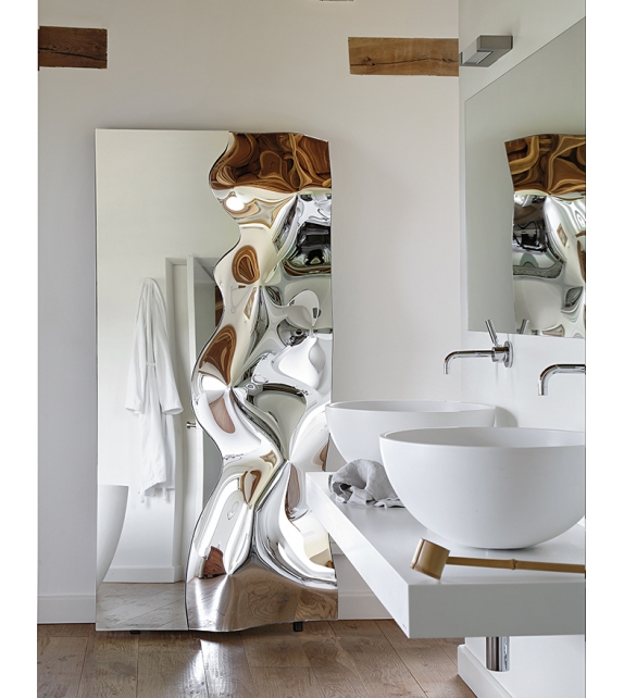 Phantom A diseñado por Helidon Xhixha & Dante O. Benini - Luca Gonzo para Fiam es un espejo rectangular en vidrio fundido de alta temperatura de 6 mm, con respaldo plateado. Espejo plano de 5 mm. Marco trasero en metal pintado. Se puede colgar en varias posiciones.