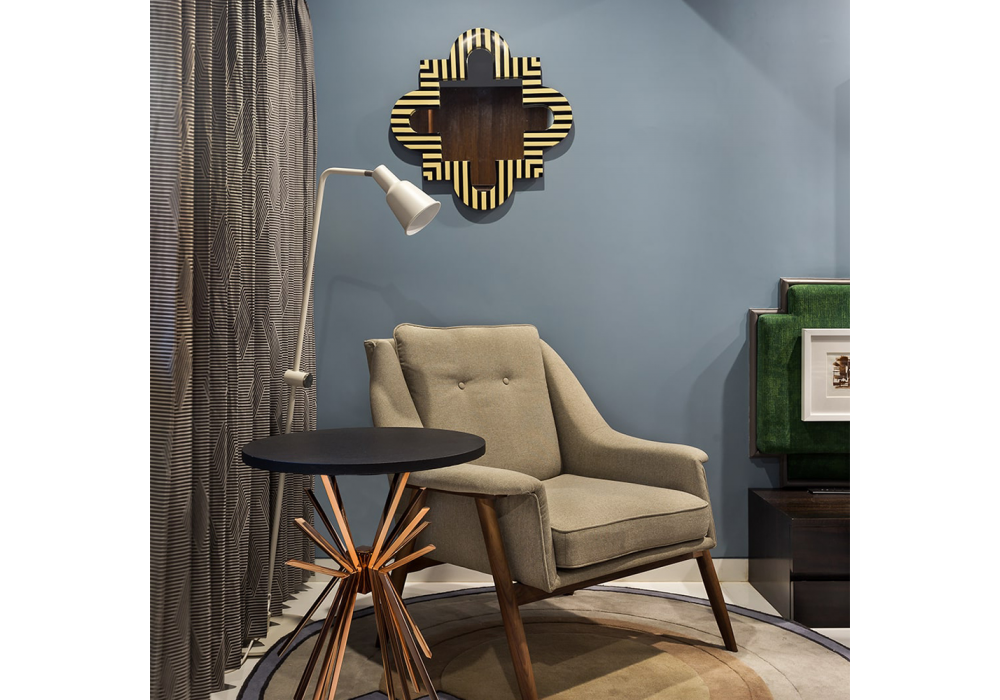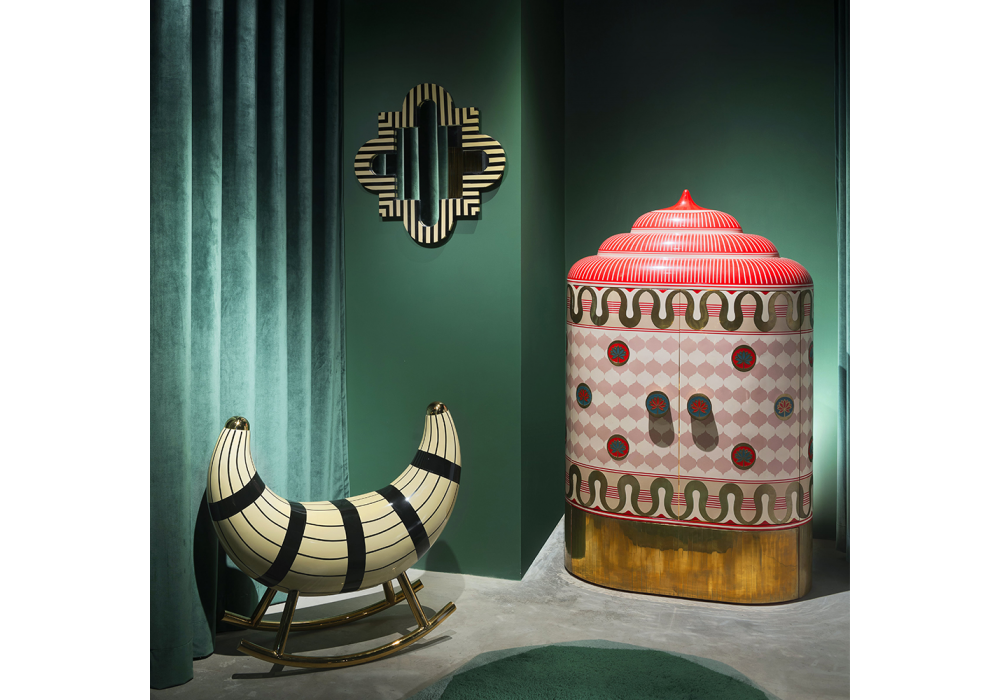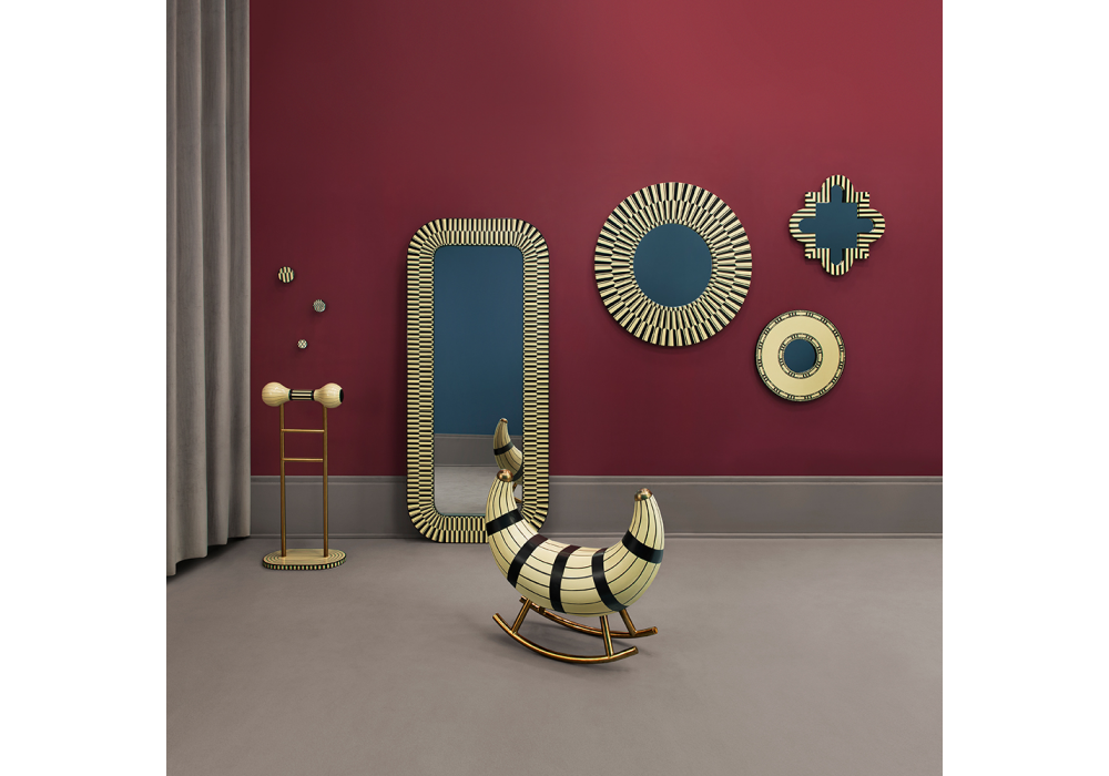 Wings diseñado por Matteo Cibic para Scarlet Splendor es un espejo realizado en MDF con patrón de rayas incrustado en resina brillante.